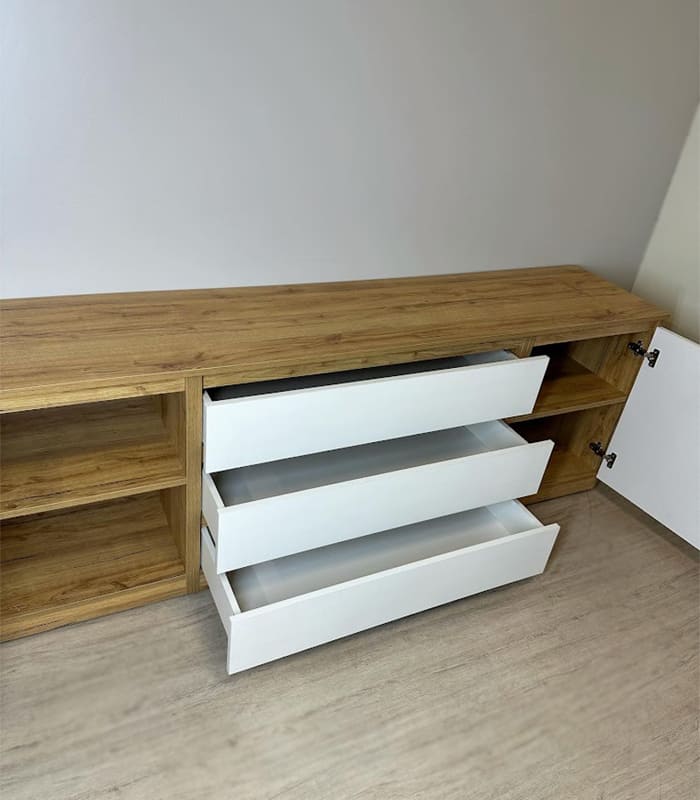 Он обладает большим объёмом и вместительностью, что позволяет удобно разместить телевизор. Также другие предметы, такие как книги, журналы, аксессуары. Благодаря своей компактности и функциональности, комод отлично впишется в любой современный интерьер и создаст атмосферу уюта и комфорта.