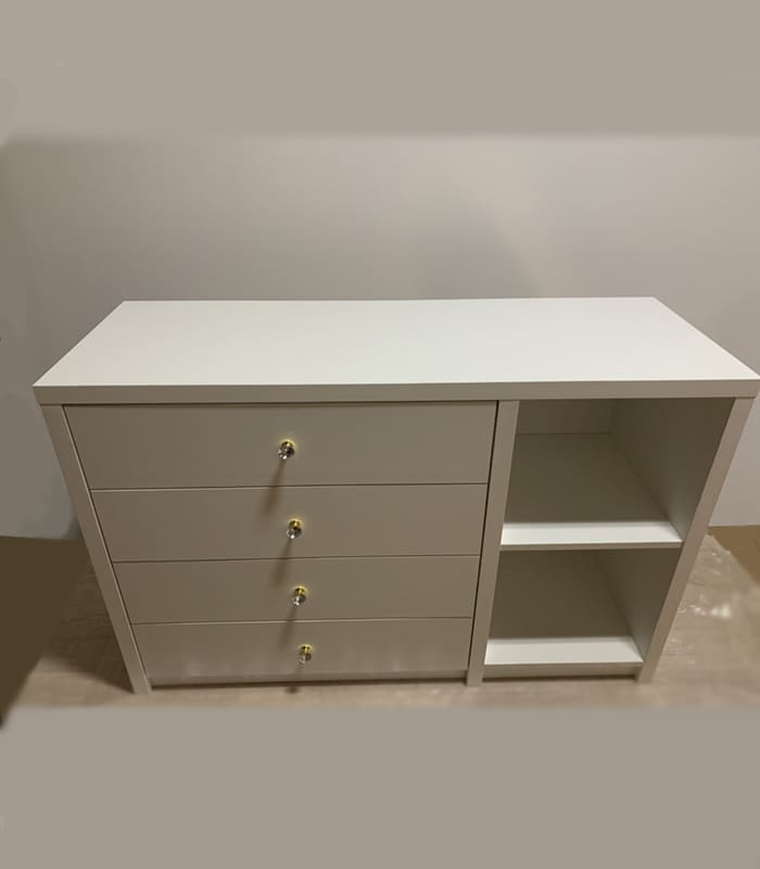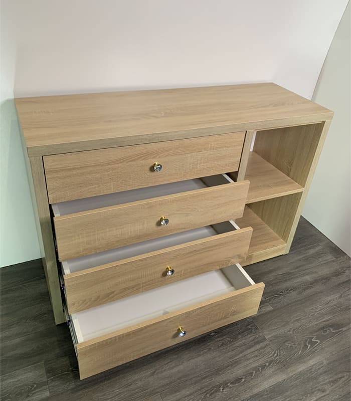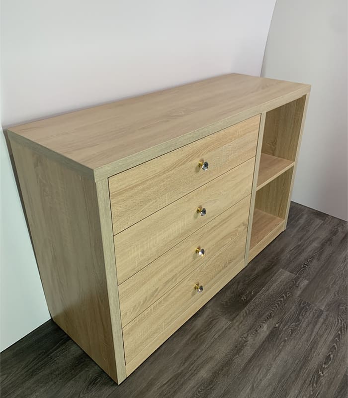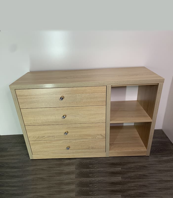 Комод имеет четыре удобных ящика, которые позволяют организовать хранение различных предметов, таких как одежда, постельное бельё, книги и многое другое. Благодаря своей компактности и вместительности, он идеально подходит для использования в спальне, детской комнате, гостиной или кабинете.