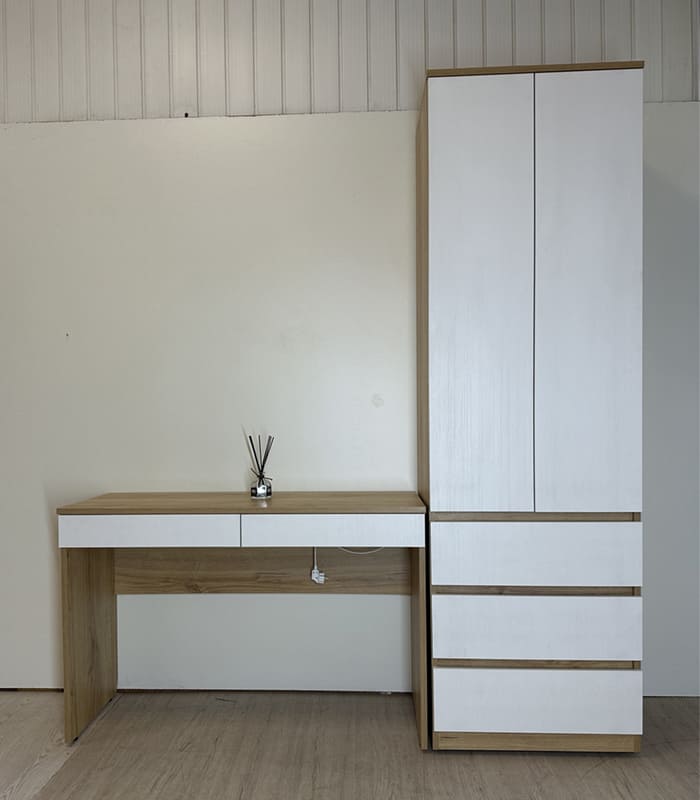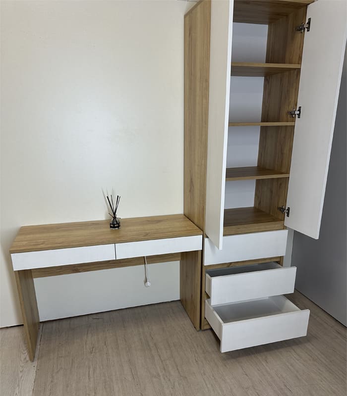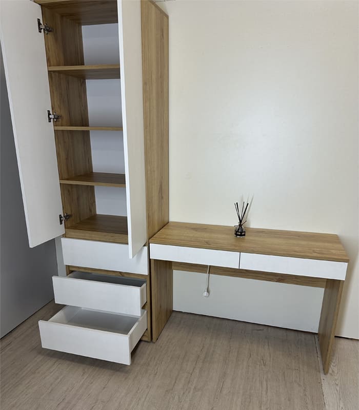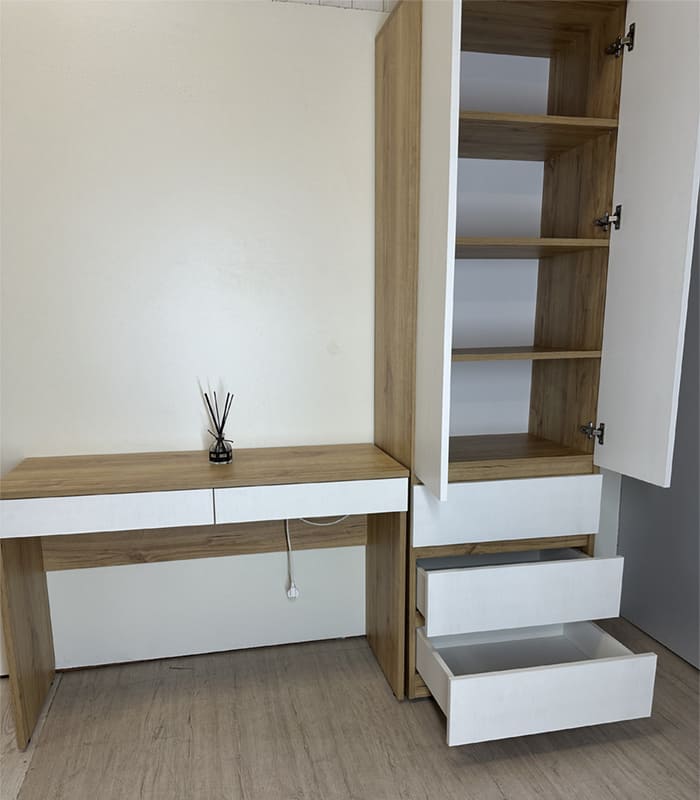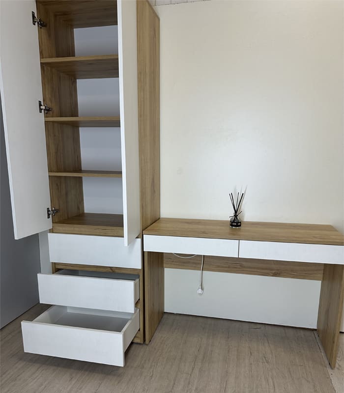 Распашной шкаф с ящиками — это практичное решение для хранения одежды, белья и других предметов. Он может быть установлен отдельно или в комплекте со столиком, создавая гармоничное и функциональное пространство.
